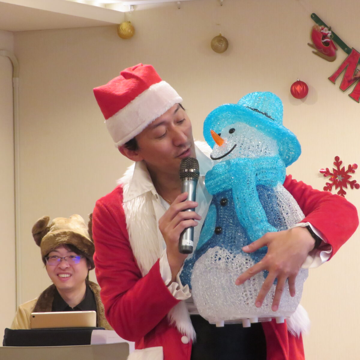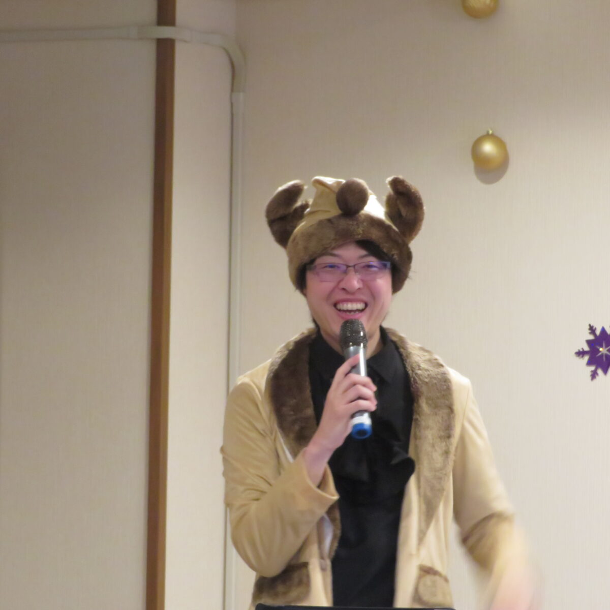 ピアニストの高知尾さんはトナカイに扮しながらも