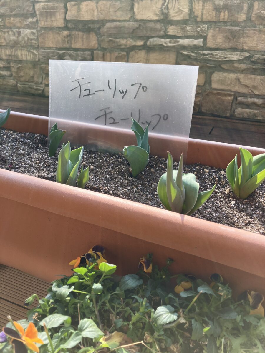 陽だまりのプランターからは、チューリップの若葉が顔を出しました。