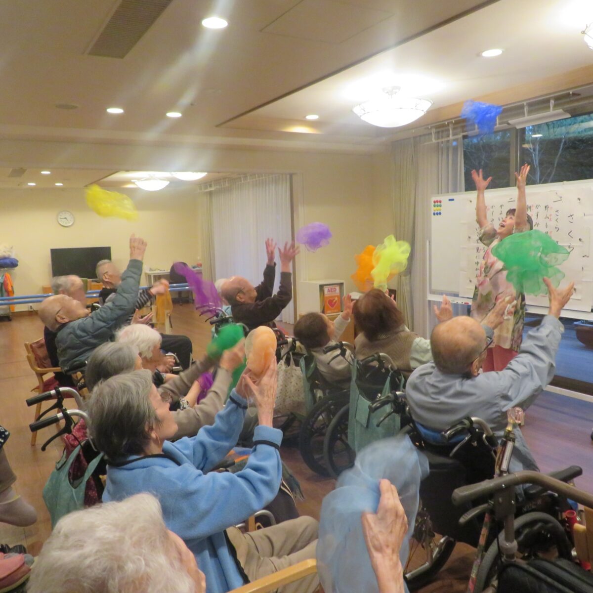 歌の会では、ただ口ずさむだけでなく、イントロクイズや軽い体操も取り入れております。思い出の曲や懐かしいメロディが流れると、自然と笑顔がこぼれ「あの頃を」を思い出される方もいらっしゃいます。色とりどりのスカーフを使った体操では、皆さまがゆったりと腕を伸ばし、音楽に合わせてたのし気に身体を動かされていらっしゃいました。華やかなスカーフが宙を舞うと、一段と明るい雰囲気になり、会場には温かな笑い声があふれていました。