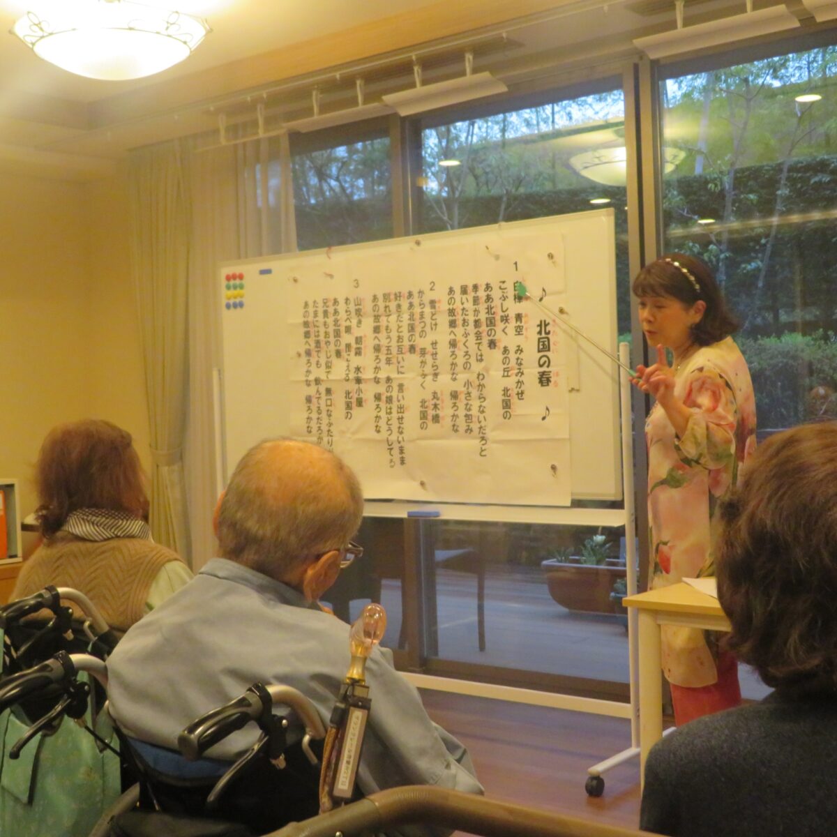 そのあとは、歌詞カードを手に「北国の春」など馴染み深い曲を全員で合唱しました。歌声に合わせて穏やかな会話も弾み、和やかなひとときとなりました。私どもスタッフも、皆さまのいきいきとしたご様子に、音楽の持つ温かな力とパワーを改めて感じております。今後も、心も身体もリフレッシュできるような、やさしくもあり楽しい音楽の時間を大切に続けてまいります。