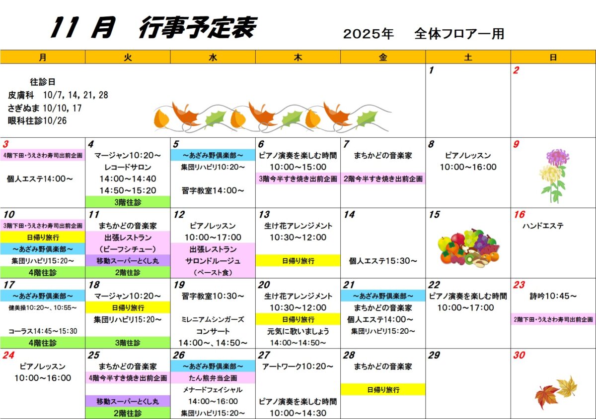11月行事予定表 2025 10/15 グランケアあざみ野 イベント 暮らしの様子 2025年10月15日 11月は、春と秋に企画している日帰り旅行を予定しています。 今回は19名の方が申し込みされました。 渋谷巡りツアー、ホテルランチ、横浜クルーズ、ご家族とのランチなど 皆様が行きたい場所へ個別外出に外出です。 11月は、他にも3か月に一度開催している「レコードサロン」、 グランクレール文化基金によるコンサートも予定しております。 随時ブログにてご紹介してまいりますので どうぞお楽しみに☆☆ グランケアあざみ野 イベント 暮らしの様子