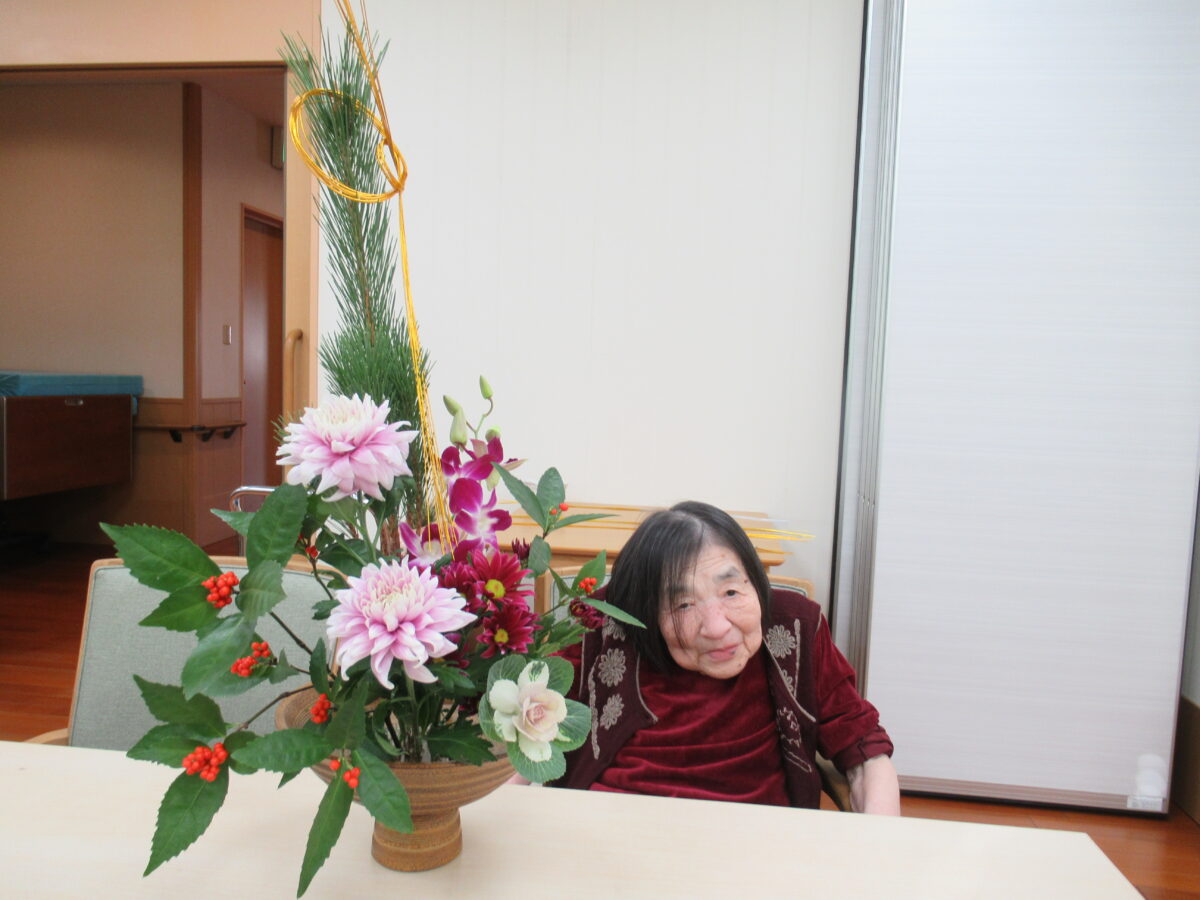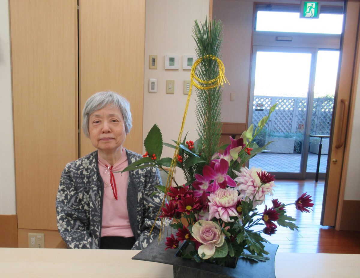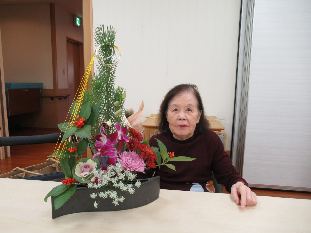 お正月の花(生け花・フラワーアレンジメント) 2026 1/10 グランケアあざみ野 イベント 暮らしの様子 2026年1月10日 年末29日に お正月の生け花・フラワーアレンジメントを活けました 普段は月2回実施して合計40名の方が参加されますが この日は、午前午後を通して40名の方が参加されました! グランケアのご入居者は80名ですので 2人に1人が参加される人気のアクティビティです☆ グランケアあざみ野 イベント 暮らしの様子