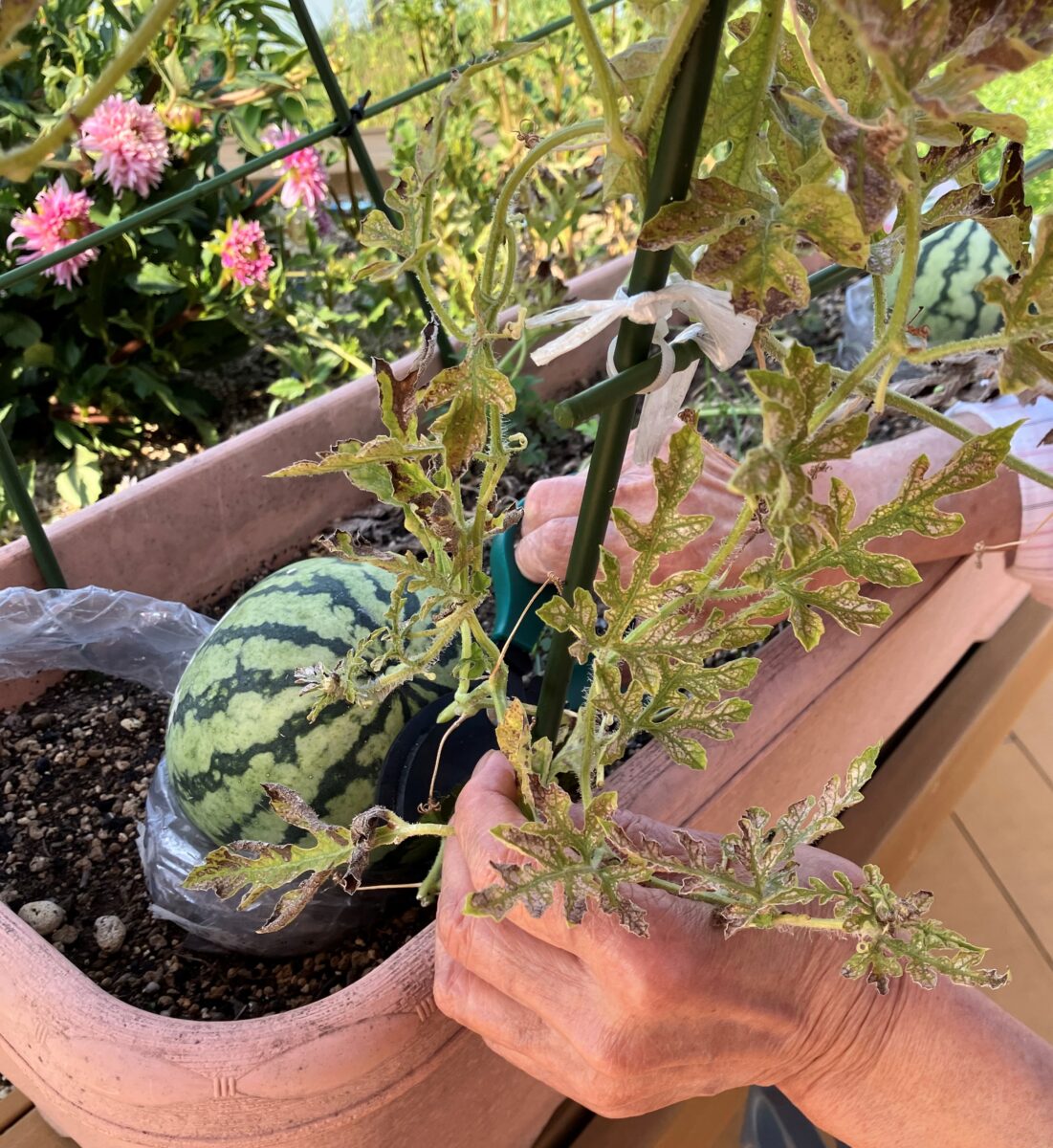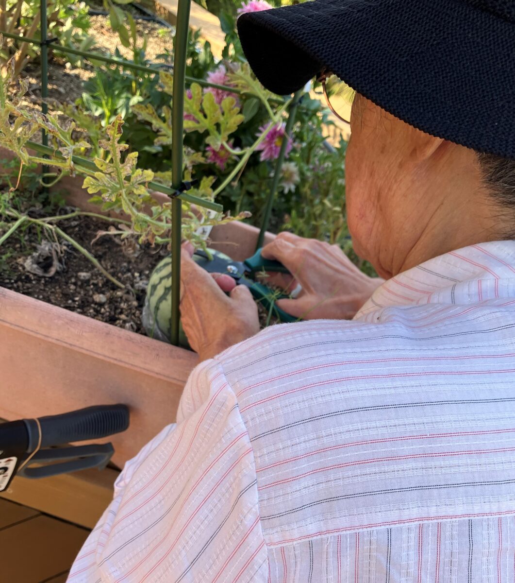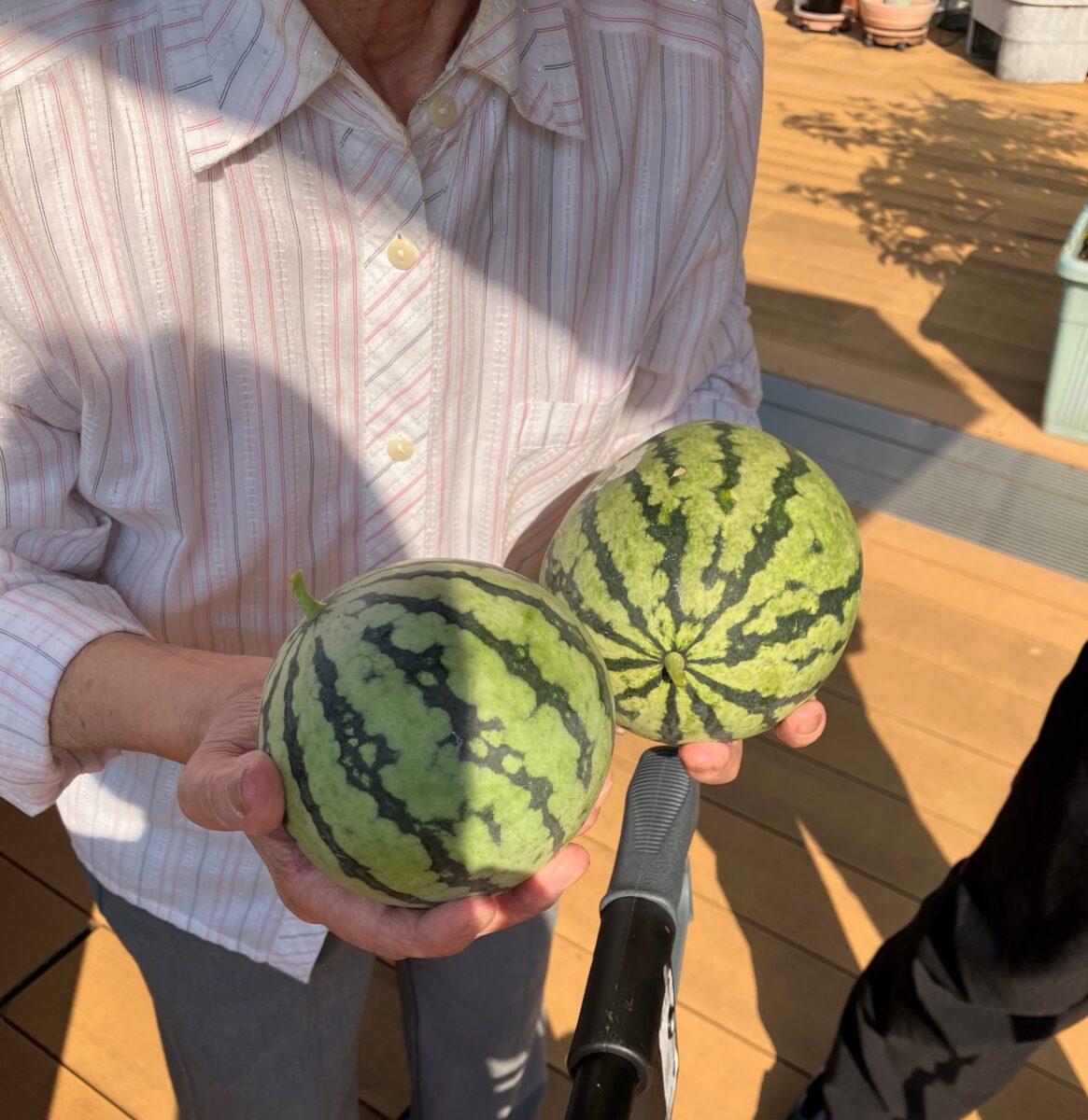 5階ガーデンにて、6月にスイカの種まきを行い順調に育ち9月9日とても天気の良い日に小玉スイカ2玉収穫することができました。