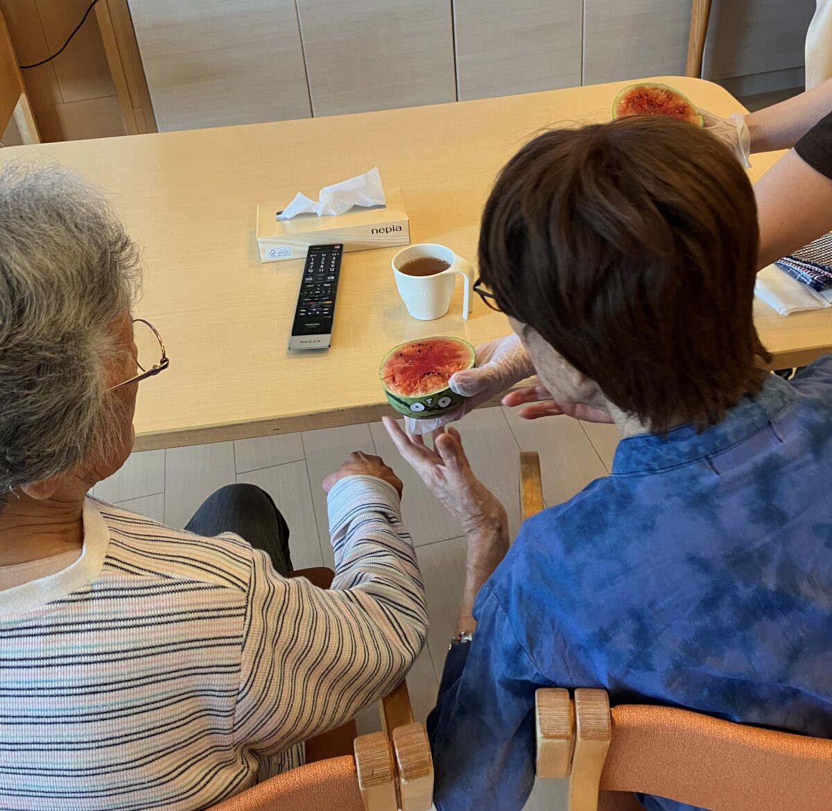 皆様エレベーター前に立ち止まりスイカをご覧になり「食べれるの?」「小さくて可愛い」等話されており、にこやかな表情をたくさん拝見することできました。