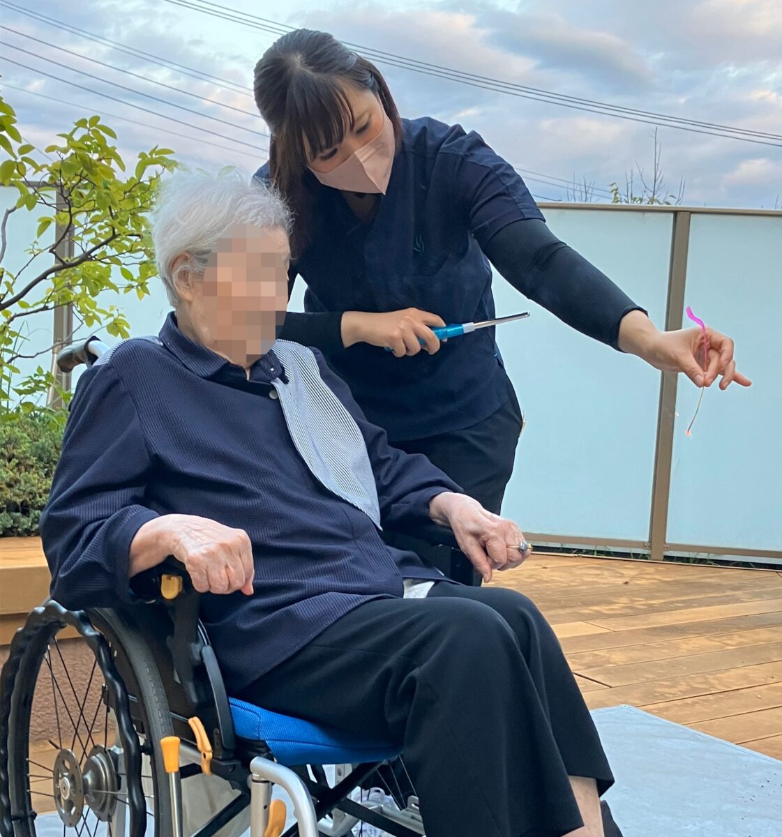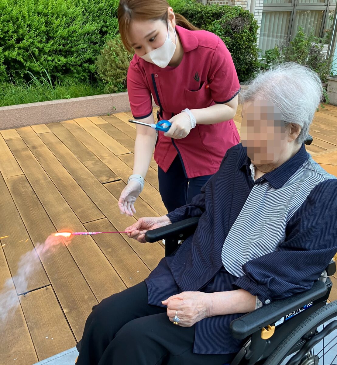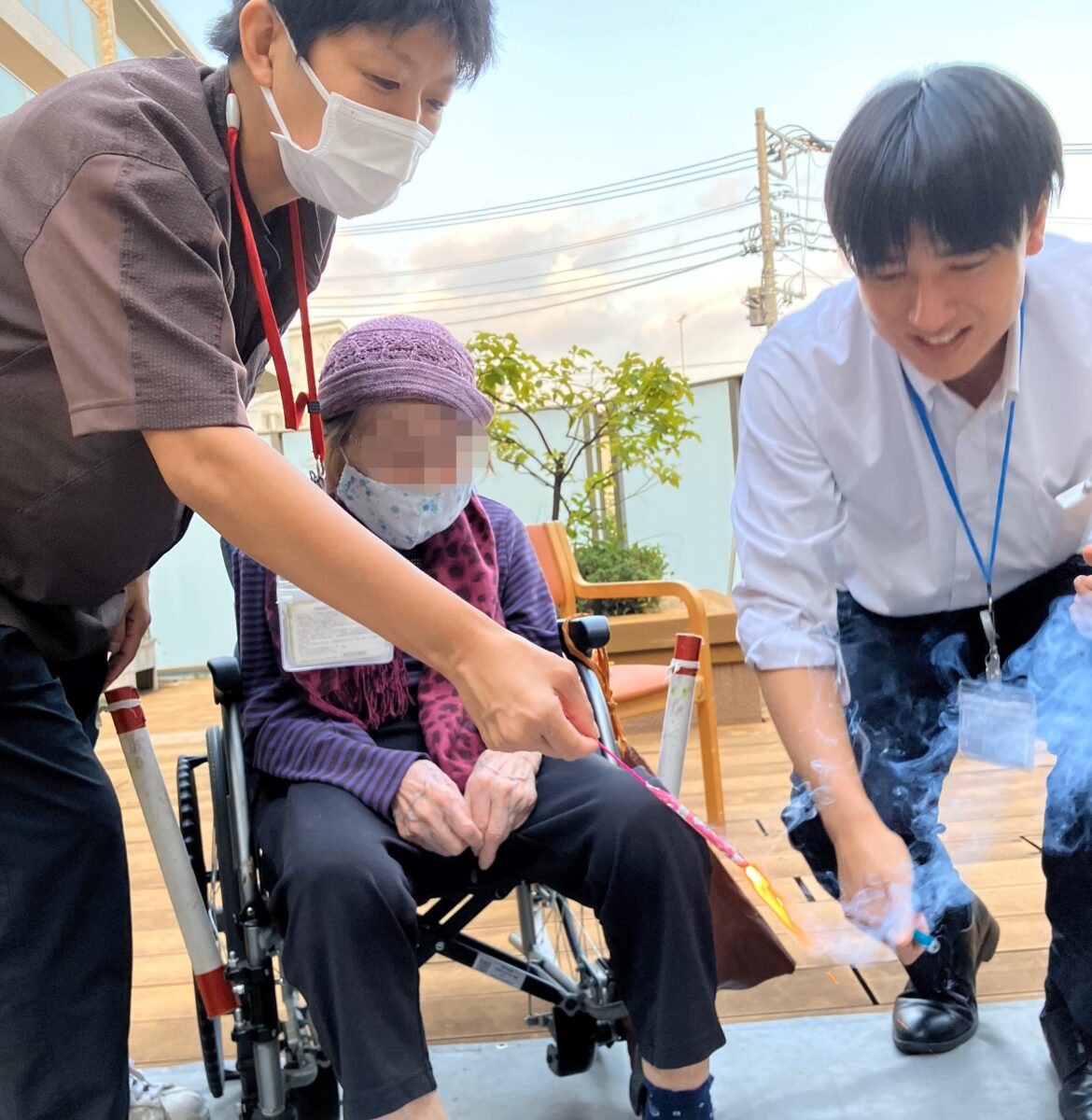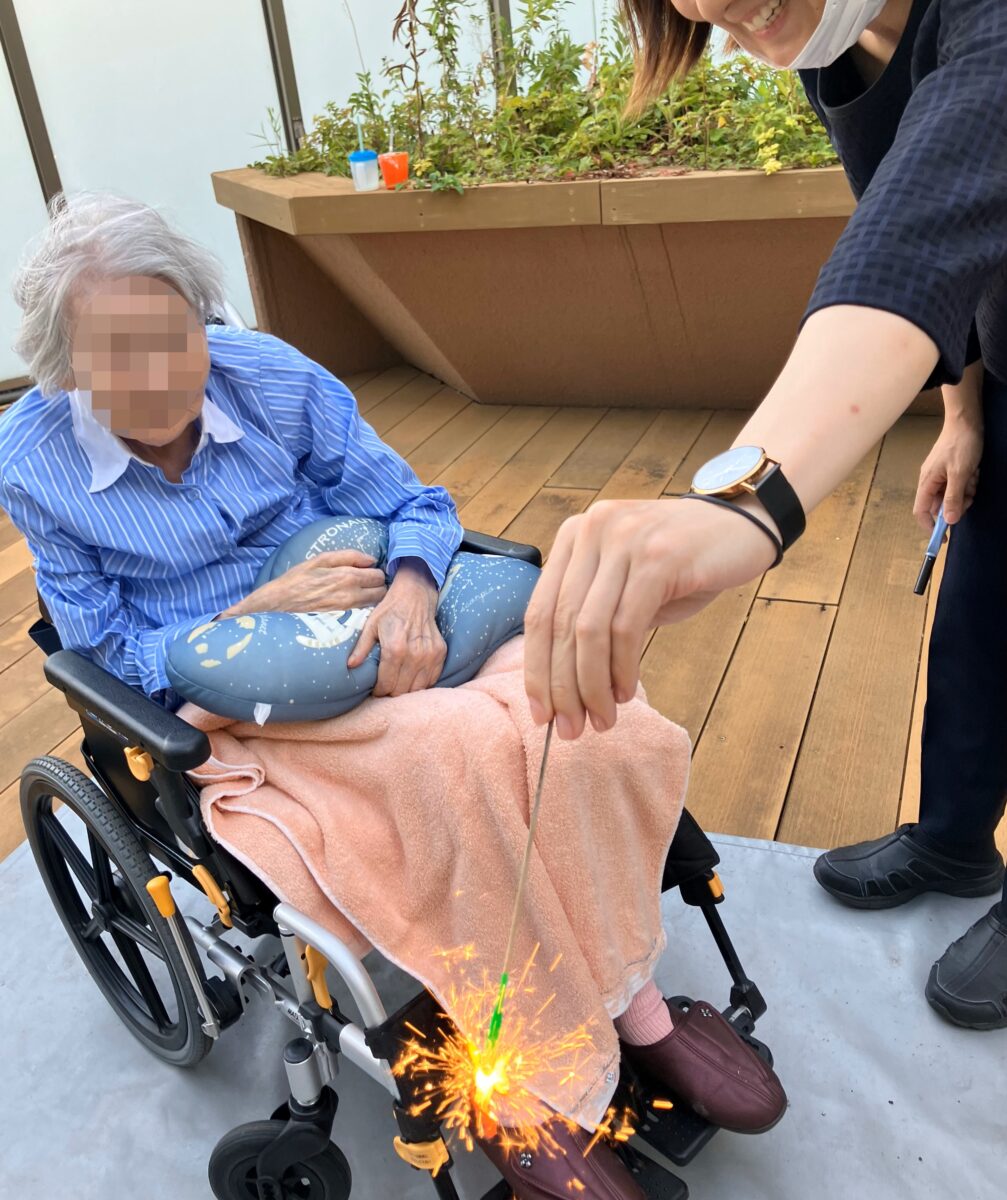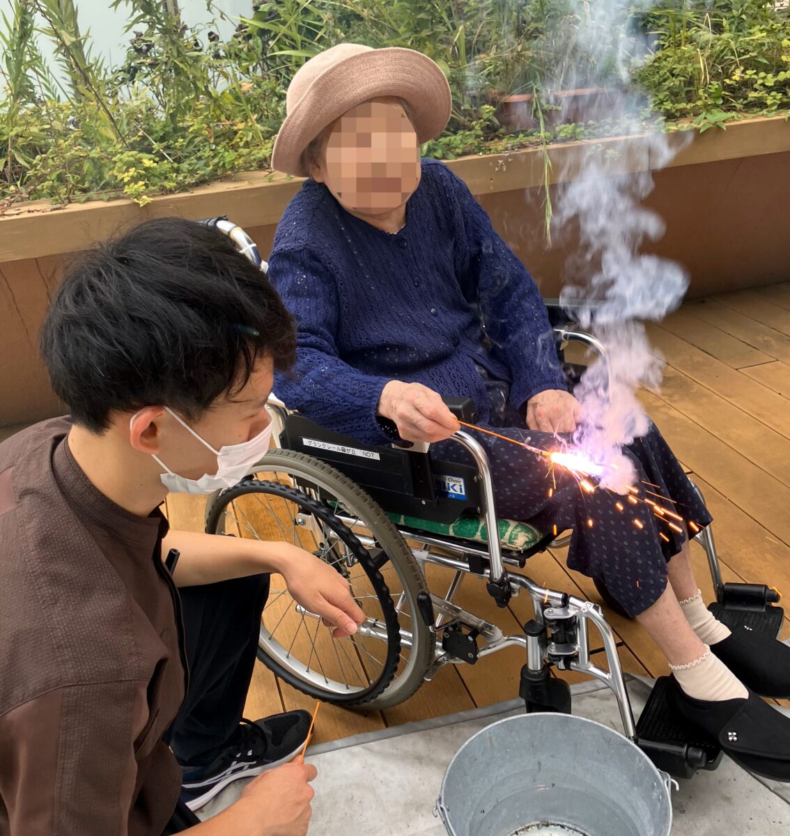 9月は【花火月間】とし、毎日数人ずつ3階ガーデンへお連れし手持ち花火を数種類楽しんでいただきました。