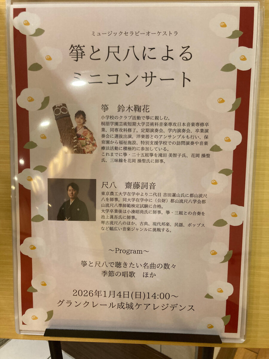 1月4日(日)、新年祝会と称して箏と尺八のミニコンサートを外部より演者さんをお招きして、実施しました。
