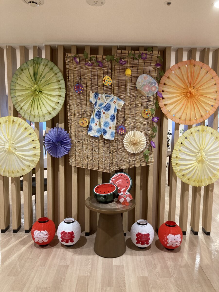 ケアレジデンスの窓口であるエレベーター前の装飾も、スタッフのこだわりに満ち溢れた夏バージョンに変更し、涼しさを演出。