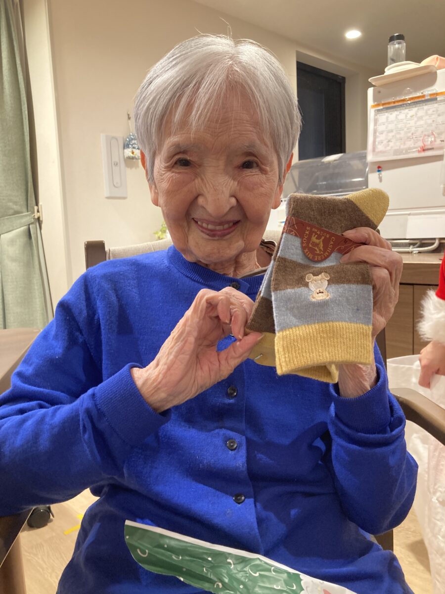 肩をたたく仕草がとてもチャーミングでした。サンタクロースからは、暖かい靴下をプレゼントしました!