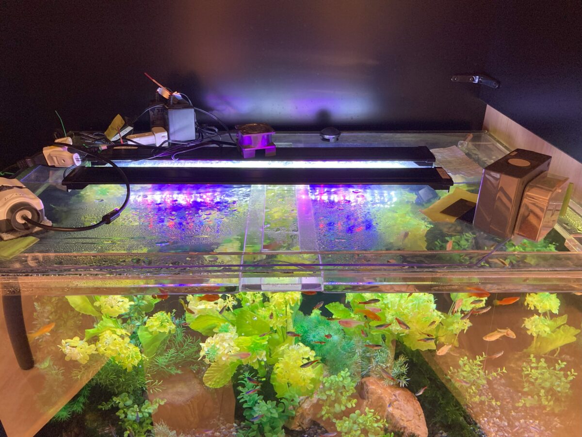 水槽の上には"フードタイマー"を設置、決まった場所から決まった時間に餌が落ちるので小さな魚たちも安心して過ごしています。
