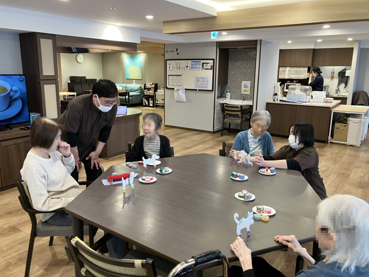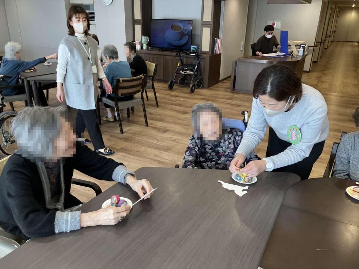 「この動物が好きだったから」「今年午年だから」と、ご自身でお好きな動物の型紙を選ばれ好みのマスキングテープを選び、ご自身でカットできる方はカットして貼り付けたり、出来ない方にはスタッフが協力して可愛らしい動物のオブジェを完成させています。