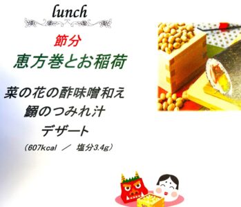 節分 2026 2/03 グランクレール青葉台 2026年2月3日 本日のランチは、節分の恵方巻をご用意。恵方の南南東に向かって願い事をしながら丸かぶり!お楽しみいただけたでしょうか。今年一年、健康に幸せに笑顔で過ごせますように。 グランクレール青葉台