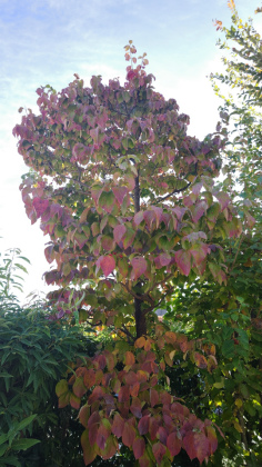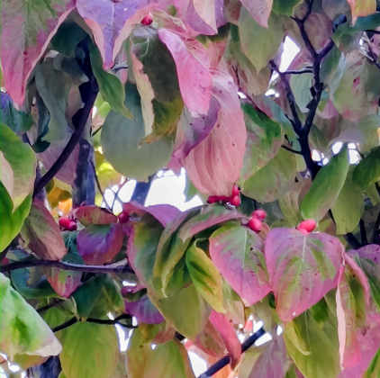 ハナミズキの葉が色づいて、よく見ると赤い小さな実が見えます。