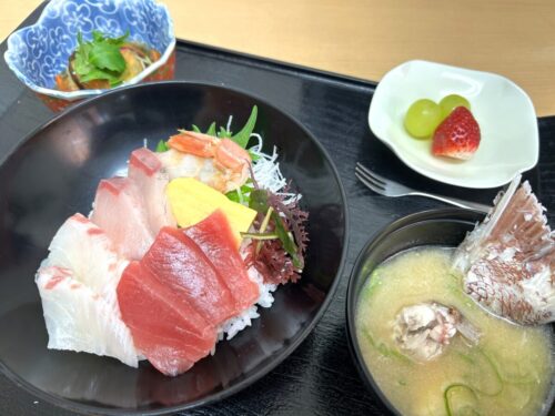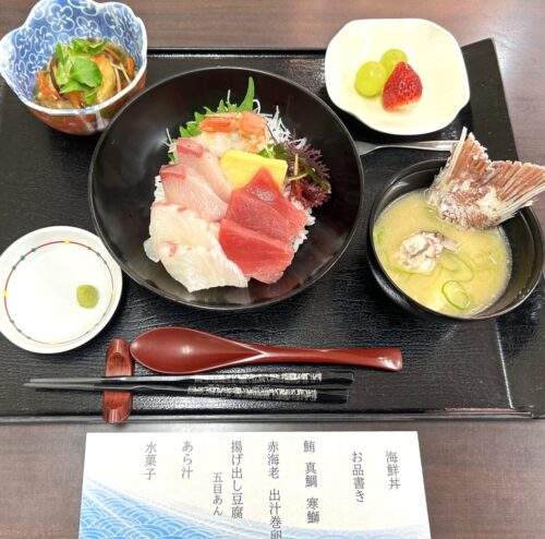 美味しそうなお刺身が並んだ海鮮丼、綺麗なあんかけの揚げ出し豆腐に、立派なあら汁が目を引きます。