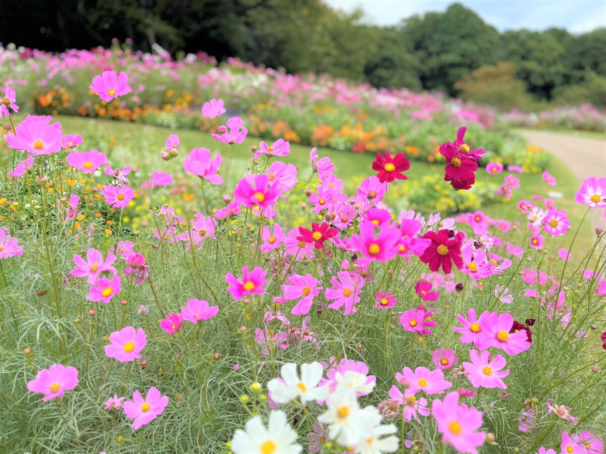 ちょうどコスモスが満開で「良いタイミングにいらしてくださいました。」とボランティアガイドさんからお声かけいただきました。右側の写真のふわふわとかわいい植物はミューレンベルギアです。最近人気のコキアと違い無農薬でも元気に育つそうです。夏にはホタルの飛び交う場所が近くにあるため農薬は使わずに花壇の花々を育てています。
