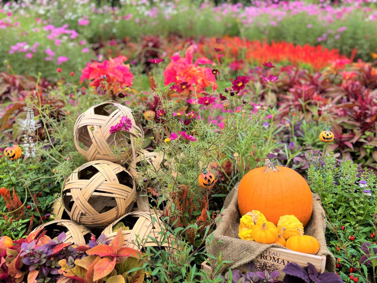 お花畑の中を進んでいくとあちらこちらにハロウィーンシーズンの装飾があり皆様の笑顔を誘います。