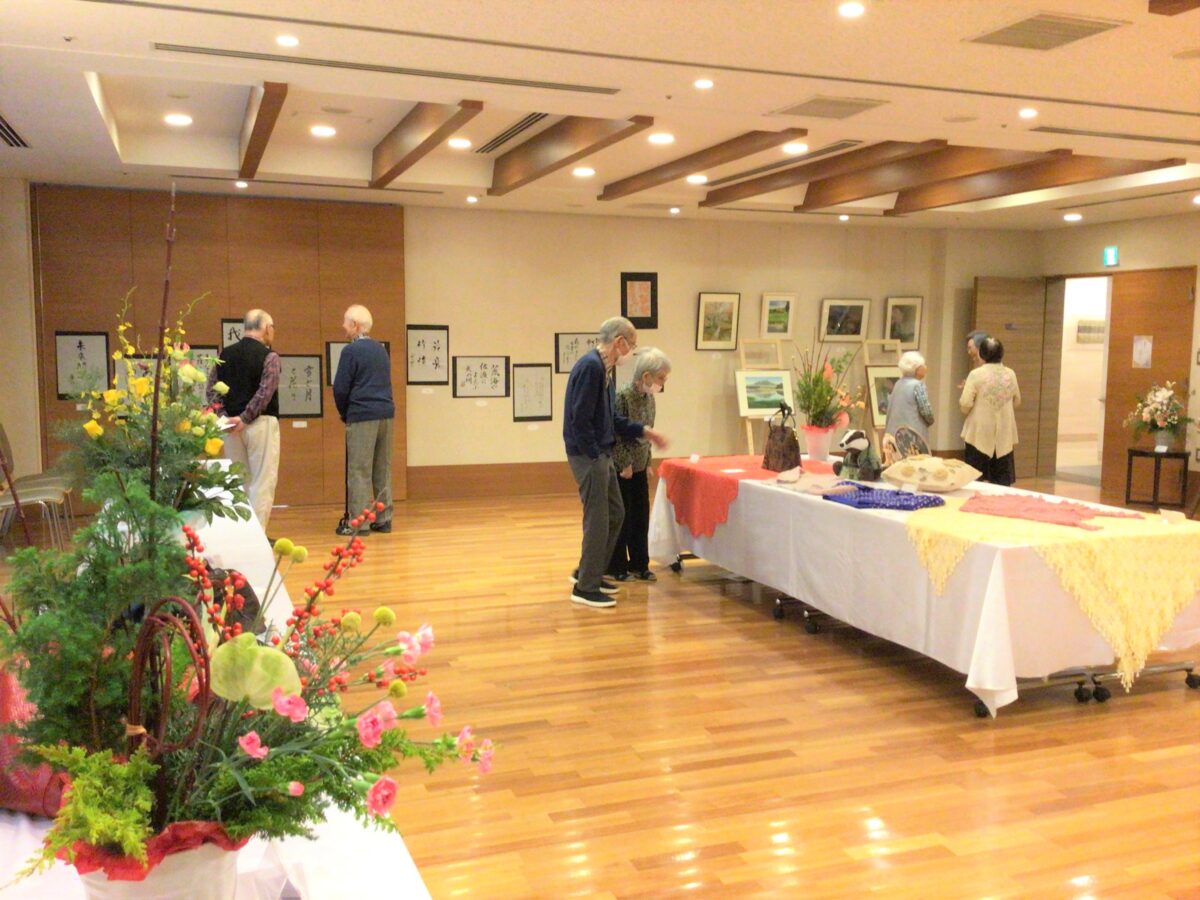 初日は作品展を行います。書道、絵画、フラワーアレンジメントの日ごろのイベントやサークルで制作した作品に加えて、個人で作られた手芸や写真、絵画に短歌など様々なジャンルの作品が出展されました。