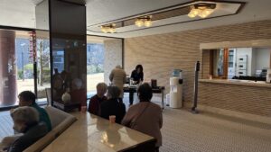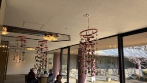 午後2時になると、ロビーにはゆったりとおしゃべりを楽しむ入居者のみなさんが集まり、窓から差し込むやわらかな日差しが、穏やかな時間をさらに心地よくしてくれていました。天井から吊るされた飾りも可愛らしく、まるで春の訪れをひと足早く感じるような演出に。