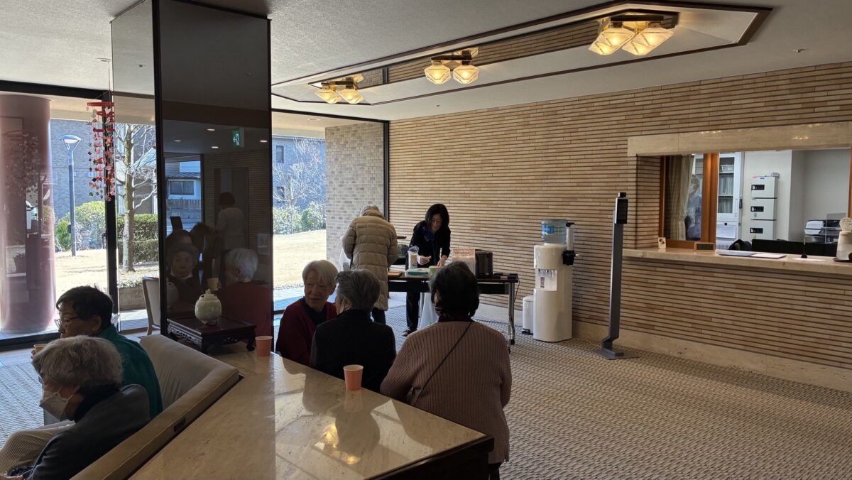 スタッフが用意したホットココアの甘い香りがロビーいっぱいに広がると、「あら、いい匂いね」「今日は特別なの?」なんて声が聞こえてきます。紙コップを手に、温かい飲み物とお菓子を楽しみながら、自然と会話が弾む光景は見ているだけでほっとするようでした。