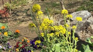 まわりにはパンジーやオレンジ色の花も彩りを添えていて、まるで小さな春の花壇ができたようでした。