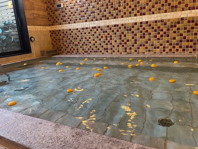 プカプカ浮かぶゆずは香りの高い高知産です。お湯に浮かべる前に香りを楽しんでいただけるように小さな穴を開けました。17時には浴室中に心地よいゆずの香りでいっぱいになりました。