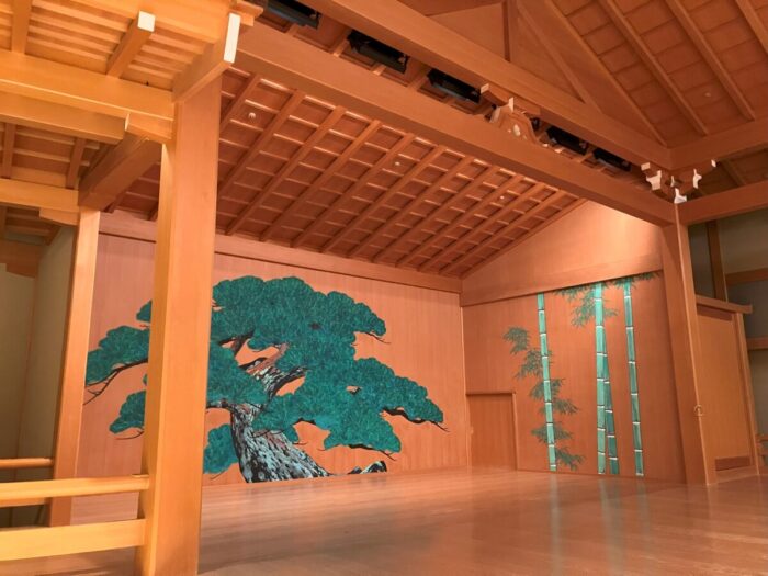 吹き抜けの空間に大きな屋根、鏡松の緑と木戸口の青竹が目を引く本舞台。