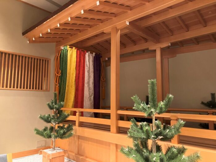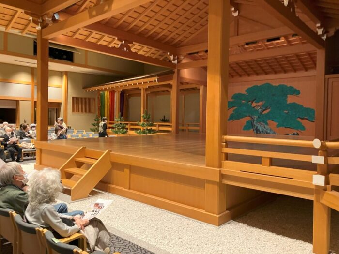 三本の松を両側に従えた橋掛かり、その奥に象徴的な五色の揚幕。
