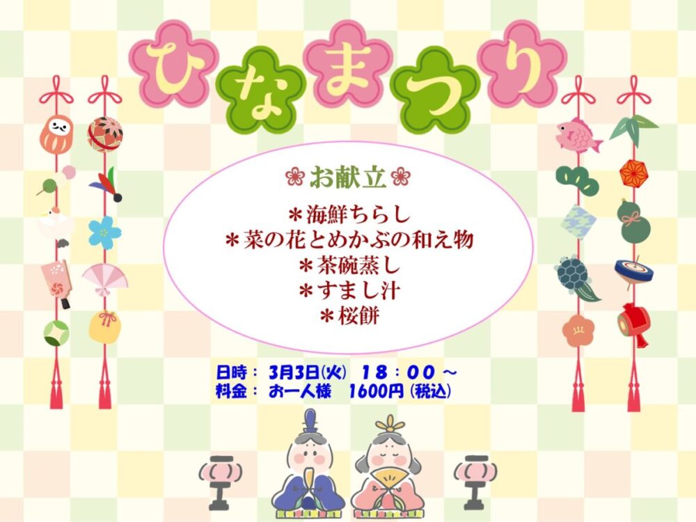 本日3月3日は桃の節句、〔ひなまつり〕です。