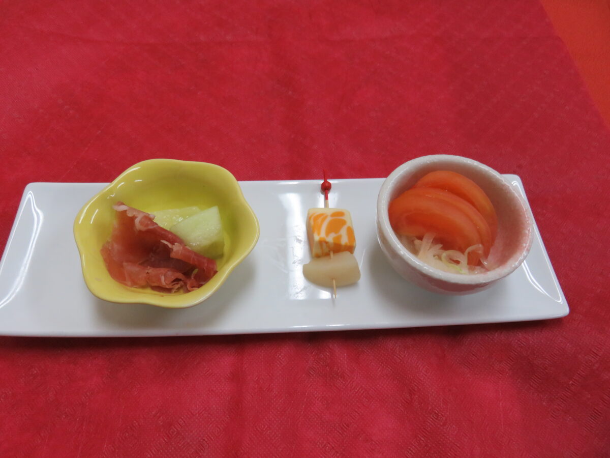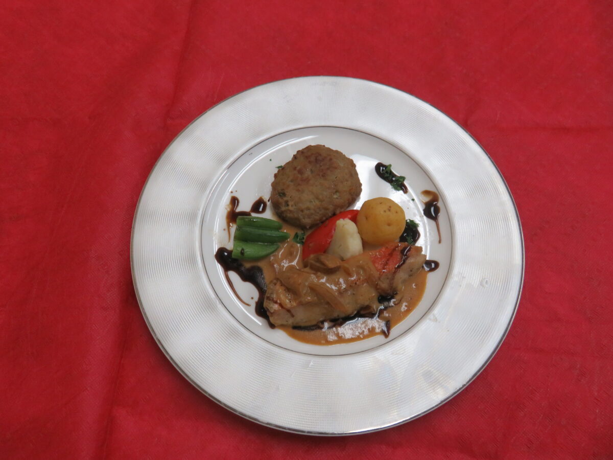 メニューは金目鯛のソテーとミニハンバーグ、前菜3種の盛り合わせなど。