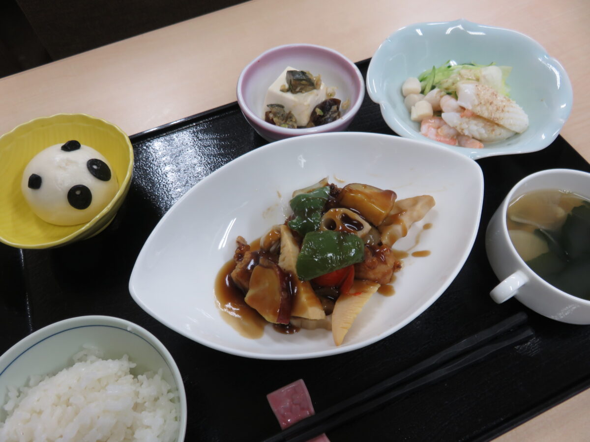 中華ディナー 2026 2/28 グランクレール成城 お食事 2026年2月28日 夕食は中国料理店「謝朋殿」(シャホウデン)監修メニューです。 黒酢で仕上げた酢豚、ピータン豆腐などが並びます。 パンダあんまんは「可愛い!」と好評でした。 グランクレール成城 お食事