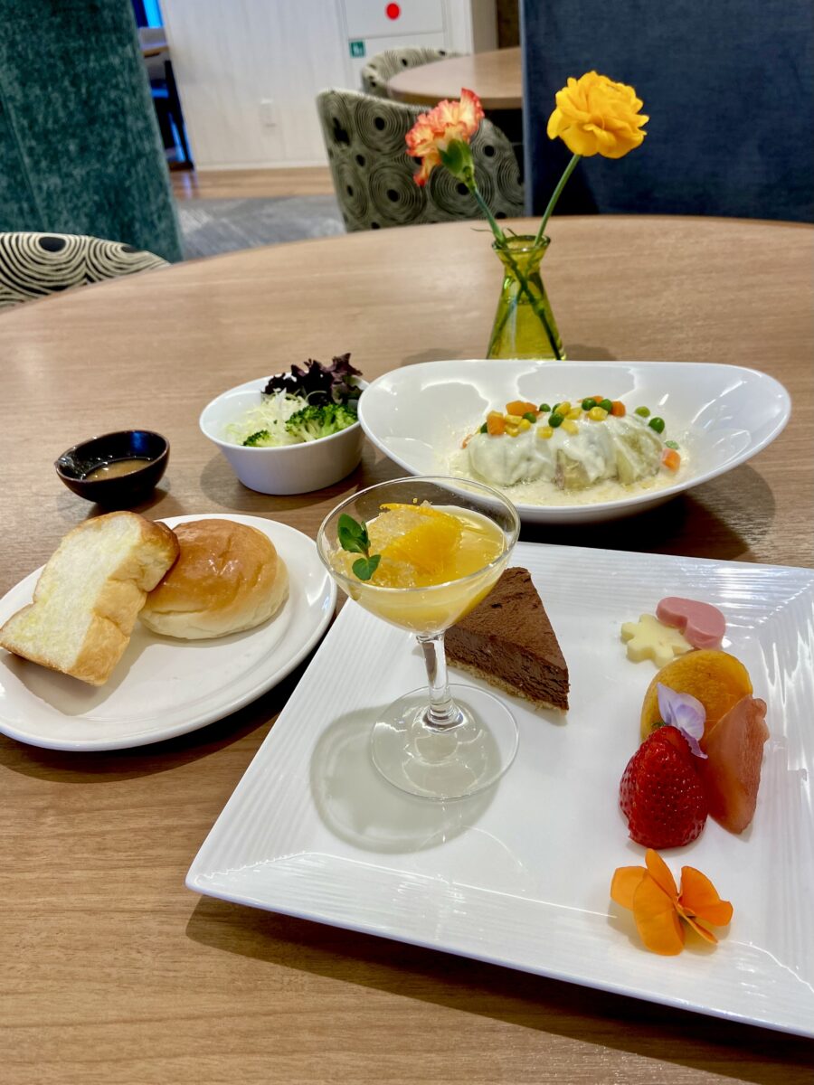 グラスに入っているのはオレンジゼリーとキラキラジュレ。