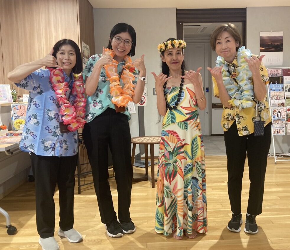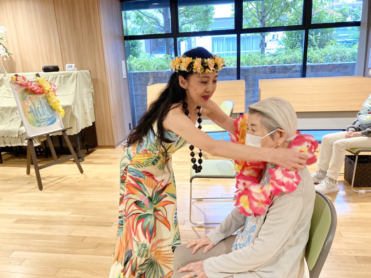 ハワイアンステップやハワイの言葉、フラのハンドモーション(手話)を教えていただきながら、体を動かします。最後はハワイアンミュージック「月の夜は」を全員で踊りながら、声を合わせて歌いました♬