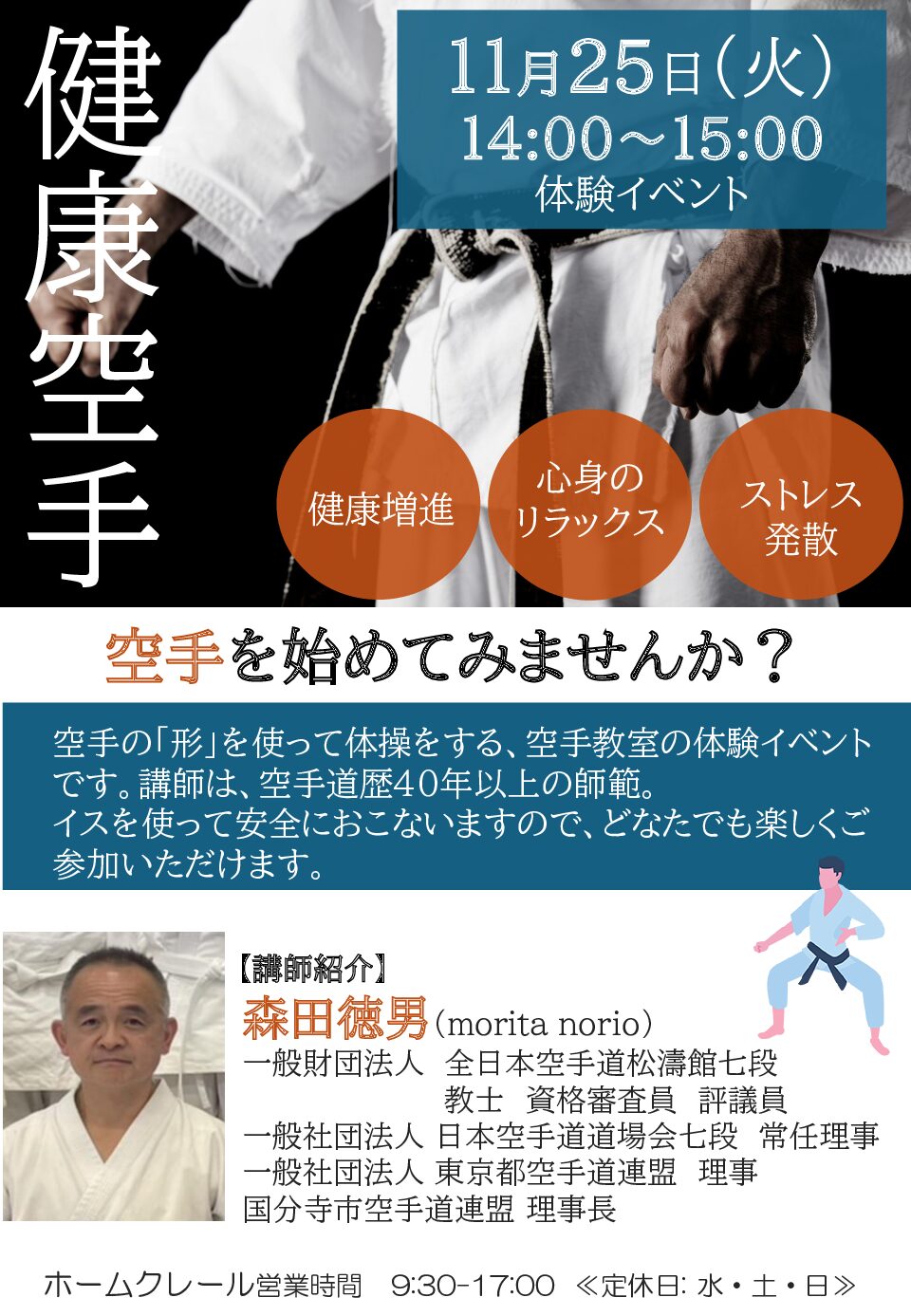 今回は多世代交流型カルチャー教室「ホームクレール立川」(グランクレール立川内に併設)で行いましたイベント「健康空手」のご紹介です。
