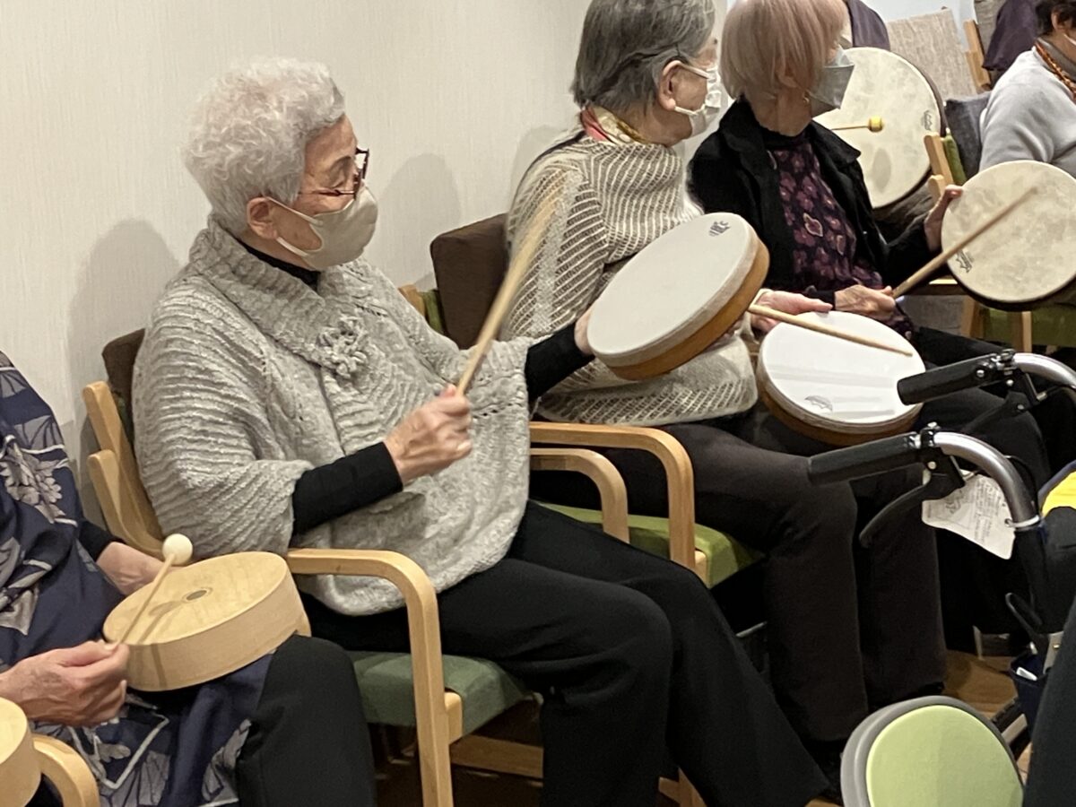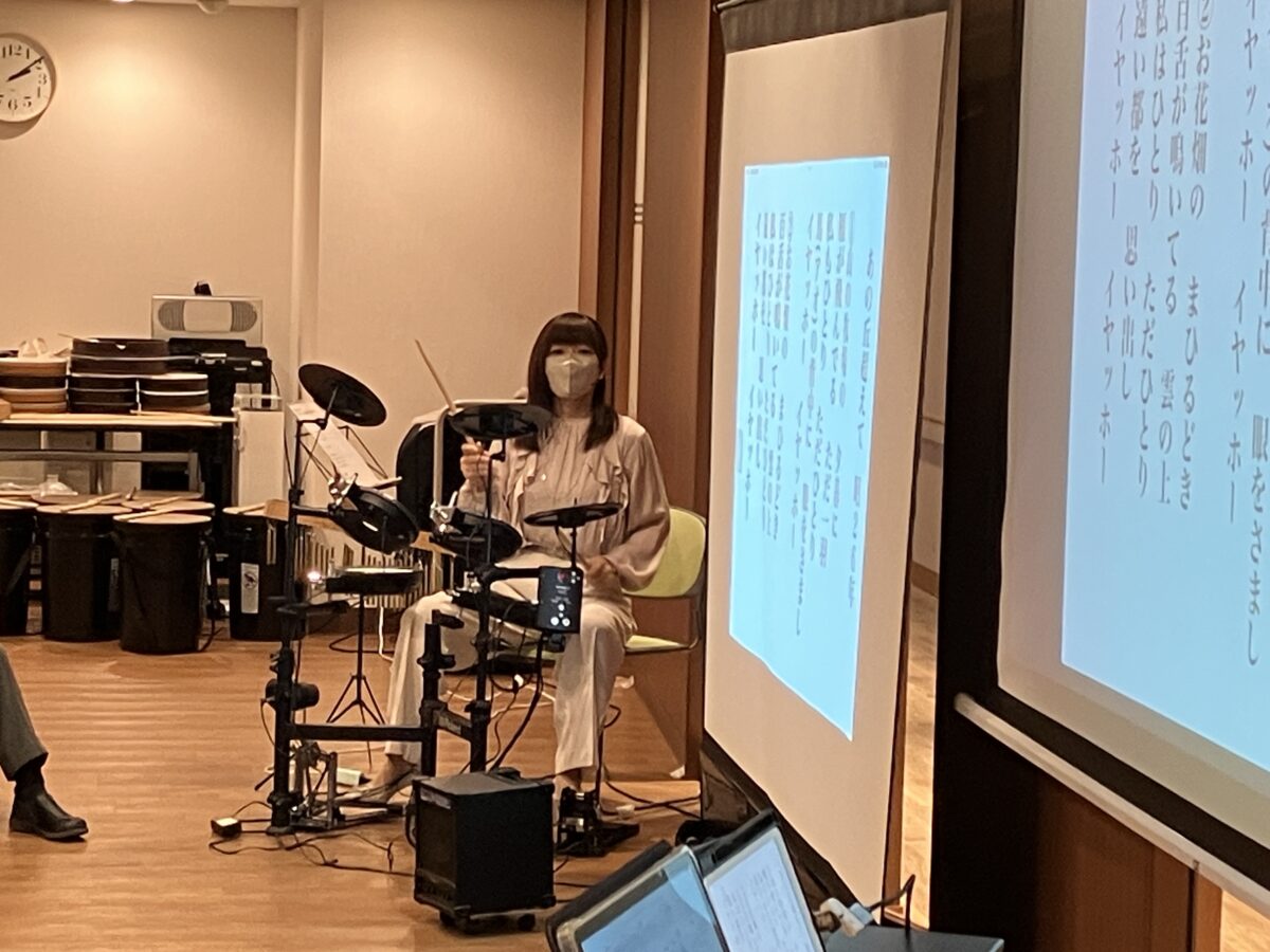 バケツドラムや太鼓等の打楽器を音に合わせリズムに乗せて叩いていただきました。