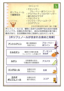 からだ元気メニュー 2025 9/24 グランクレール綱島 お食事 2025年9月24日 今日のテーマは、「ポリフェノール」 生活習慣病予防に効果的といわれる、ポリフェノール 各メニューにバランスよく取り入れられ、 味よし、効果よしの栄養士考案メニューとなっています。 ◎チキンのソースは赤ワインを遠くに感じ、甘く少し酸味があります。 ◎アーモンドが入った「バターソテー」は、カリカリとした触感がアクセント。 ◎生姜が入っているスープは、これからの季節にピッタリ! 身体が温まります。 おいしく、健康に毎日をお過ごしください。 グランクレール綱島 お食事