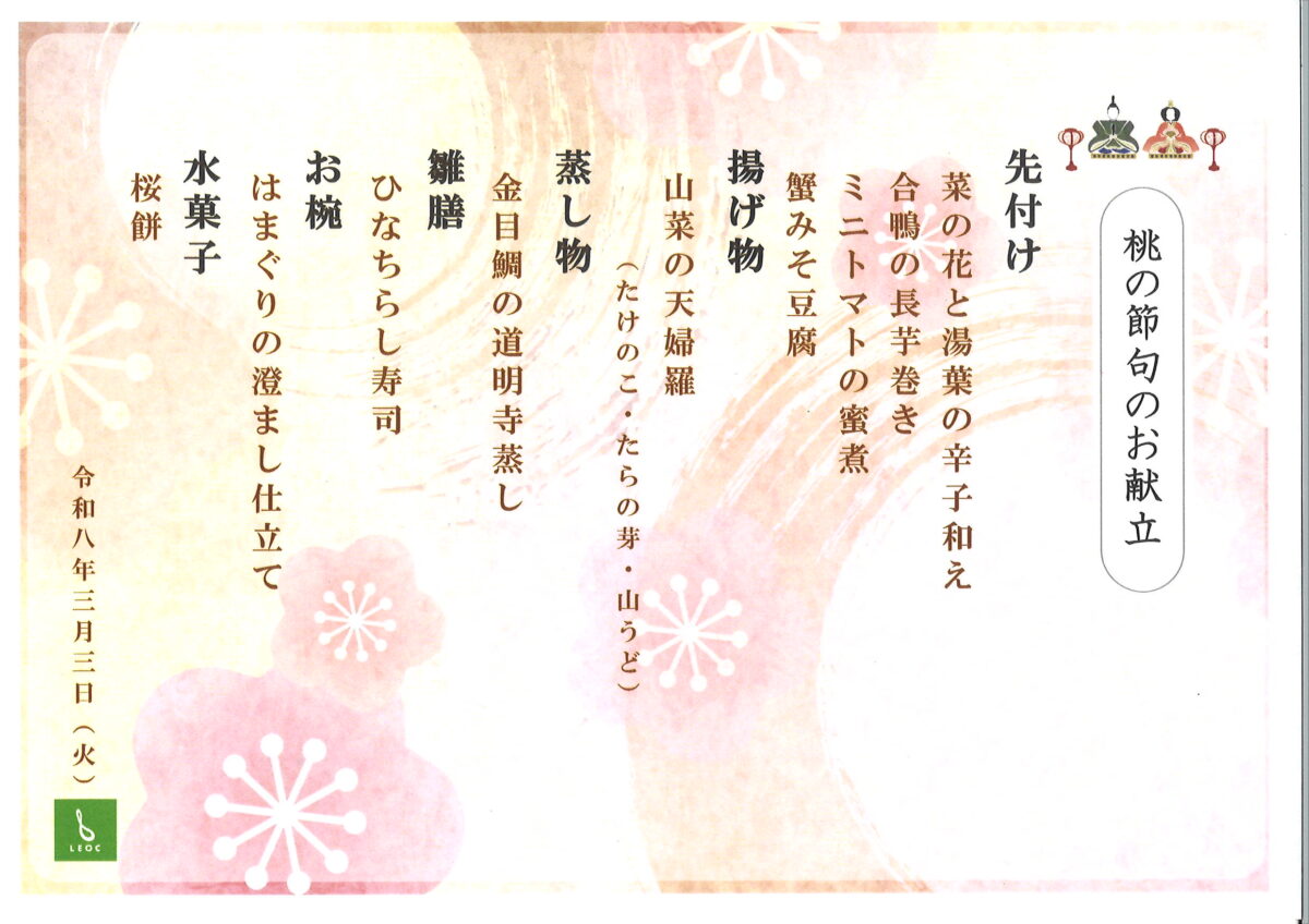 イベント食 2026 3/03 グランクレール綱島 お食事 住宅紹介 2026年3月3日 🎎🌸 桃の節句御膳 🌸🎎 コンサートの後は、お夕食をお楽しみください。 ~ミニトマトの蜜煮~ ほんのり甘く、お口直しにさっぱりと ~金目鯛の道明寺蒸し~ ふわっと道明寺の香り、お上品なお味 ~はまぐりの澄まし仕立て~ 味付けは、はまぐりのお出汁だけで 男女問わず、ひな祭りを祝った一日でした(^▽^)/ 館内のディスプレイ もちろん、 ほっこりした、優しいお顔のお内裏様とお雛様 来年またお逢いしましょう・・・ グランクレール綱島 お食事 住宅紹介