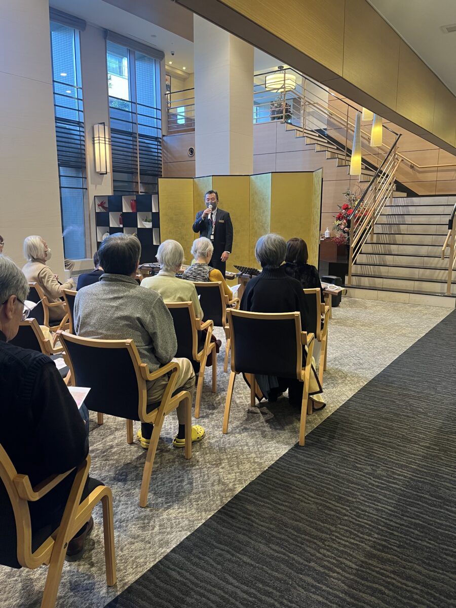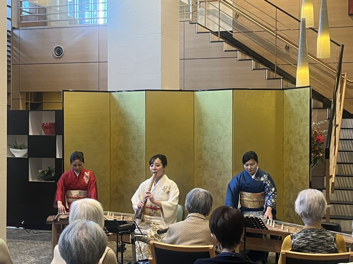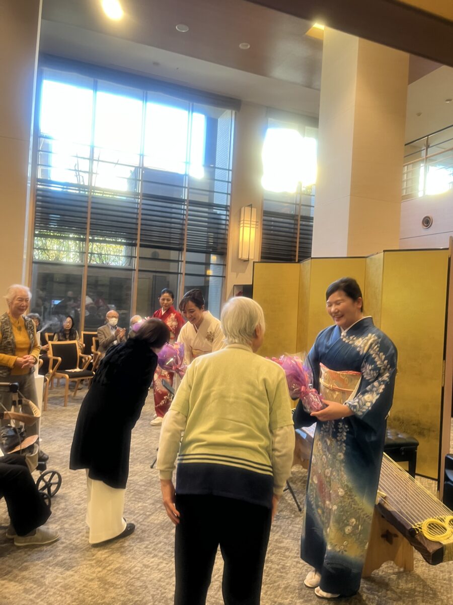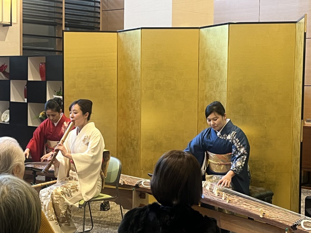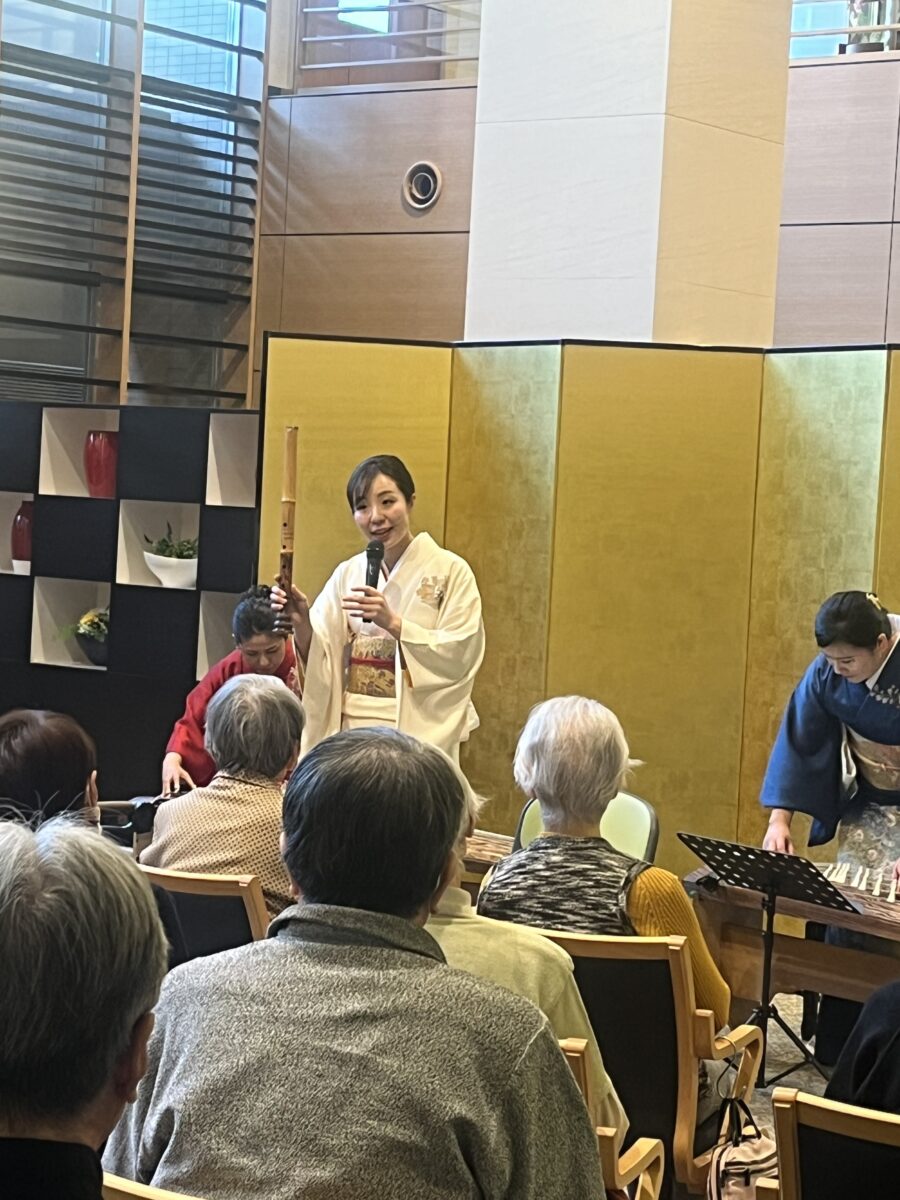 演奏は、新年にふさわしい名曲「春の海」からスタート。続いて「さくらさくら」「鷹」と続き、尺八の独奏による「鶴の巣籠」では、その深い音色に皆さまが聴き入っていました。さらに「八千代獅子」「早春賦」「花」「荒城の月」では、ご入居者の皆さまが自然と口ずさむ場面もあり、会場は温かな一体感に包まれました。
