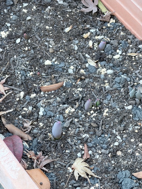 晩秋に、ふるいに掛けた去年の古い土と、新調した新しい土に、去年咲いたチューリップの球根をそっと戻していきました。