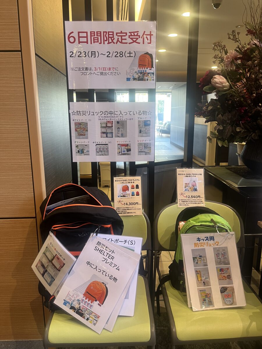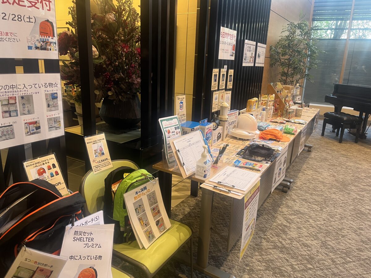エントランスホールにずらりと並ぶ防災グッズを見て、